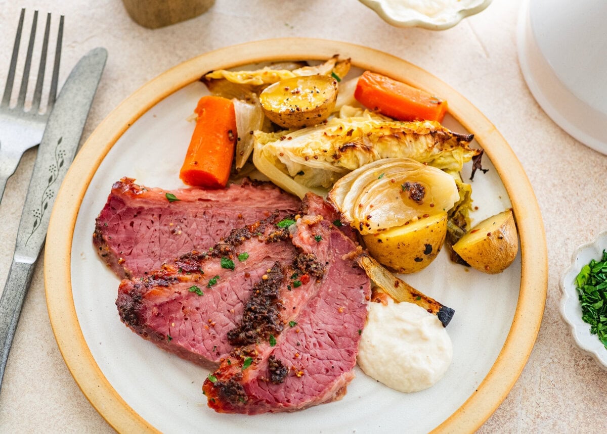 - Slice and serve: Transfer the corned beef to a cutting board and let it rest for a few minutes. Slice thinly against the grain using a serrated knife. Arrange the sliced corned beef and roasted vegetables on a platter or serving dish. Finish with fresh parsley and serve warm, with horseradish sauce on the side if you love that extra bite.