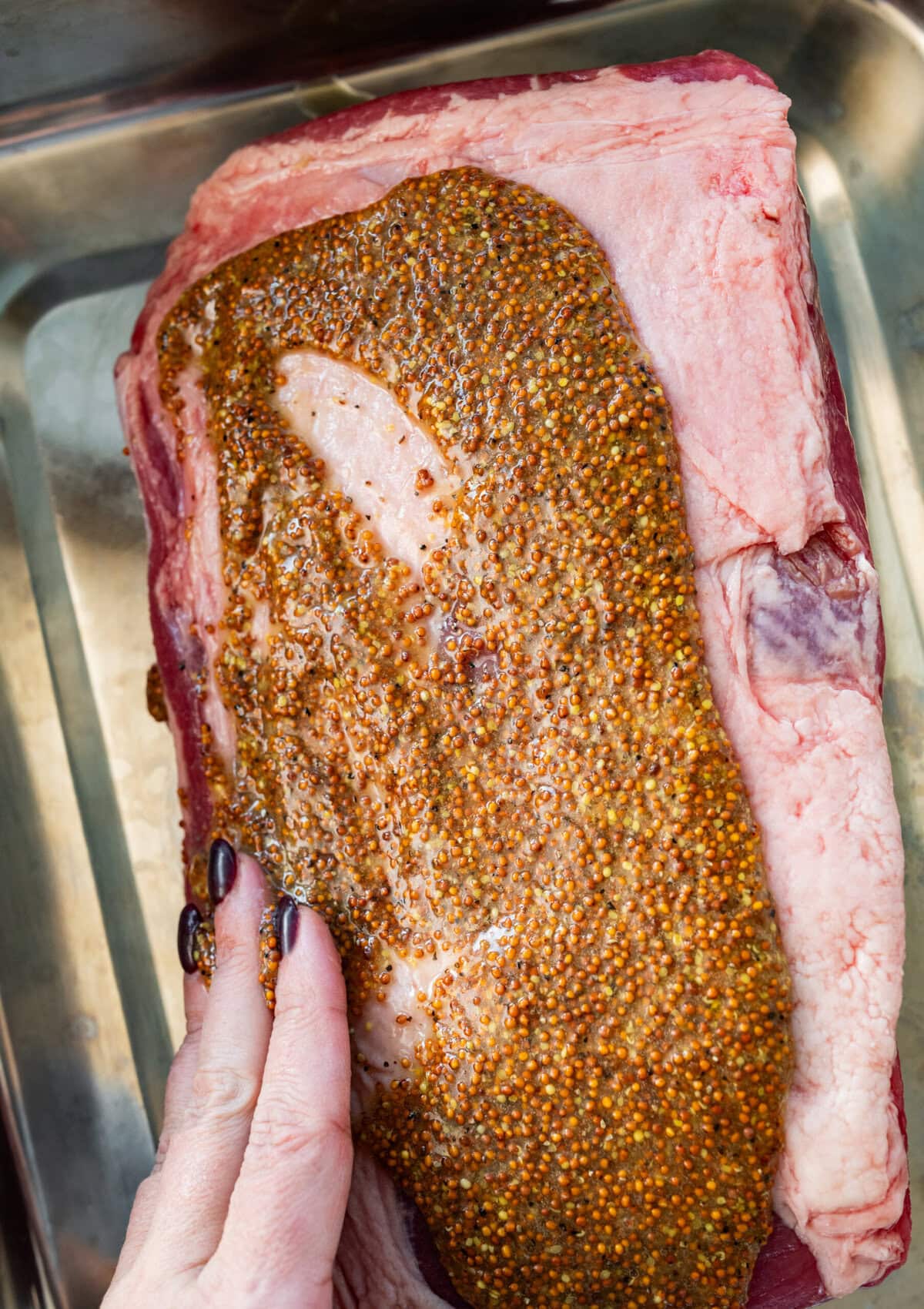 - Make the mustard rub: In a small bowl, stir together the olive oil, whole grain mustard, a generous pinch of sea salt, and freshly ground black pepper. Rub this mixture all over the top of the corned beef, focusing on the fatty side.
