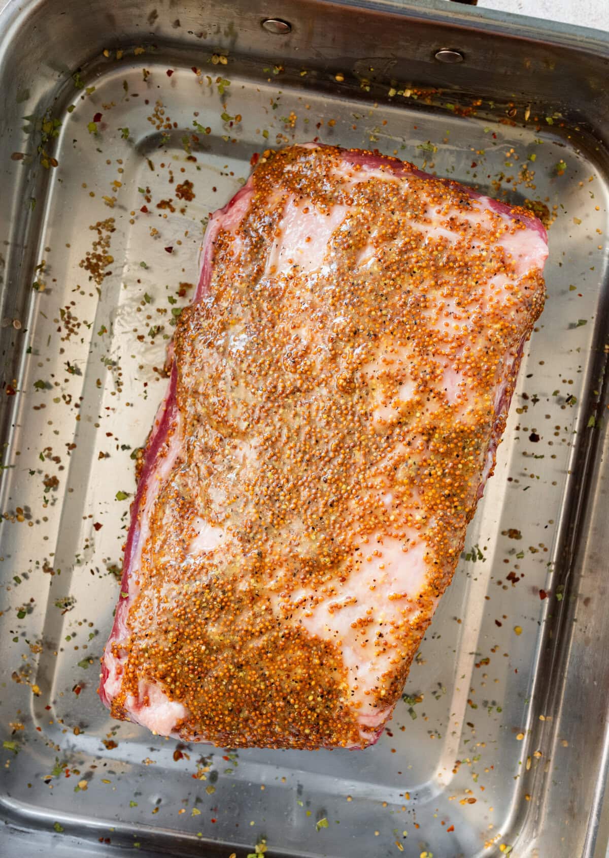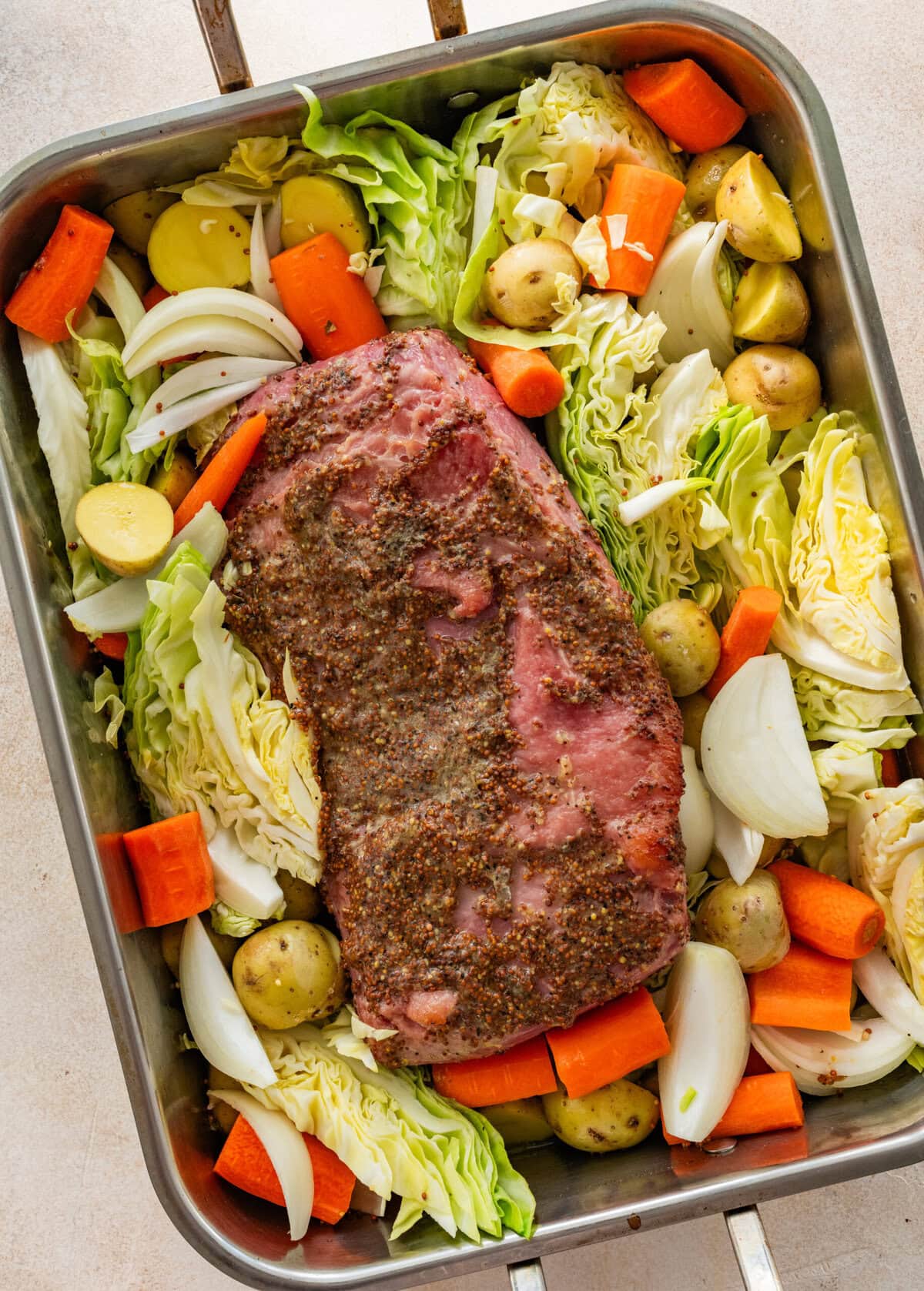 - Preheat and prep: Heat the oven to 325°F. Set out a large roasting pan. Rinse the corned beef under cold water to remove excess brine, then pat it completely dry. Place it fat side up in the center of the roasting pan. Make the mustard rub: In a small bowl, stir together the olive oil, whole grain mustard, a generous pinch of sea salt, and freshly ground black pepper.