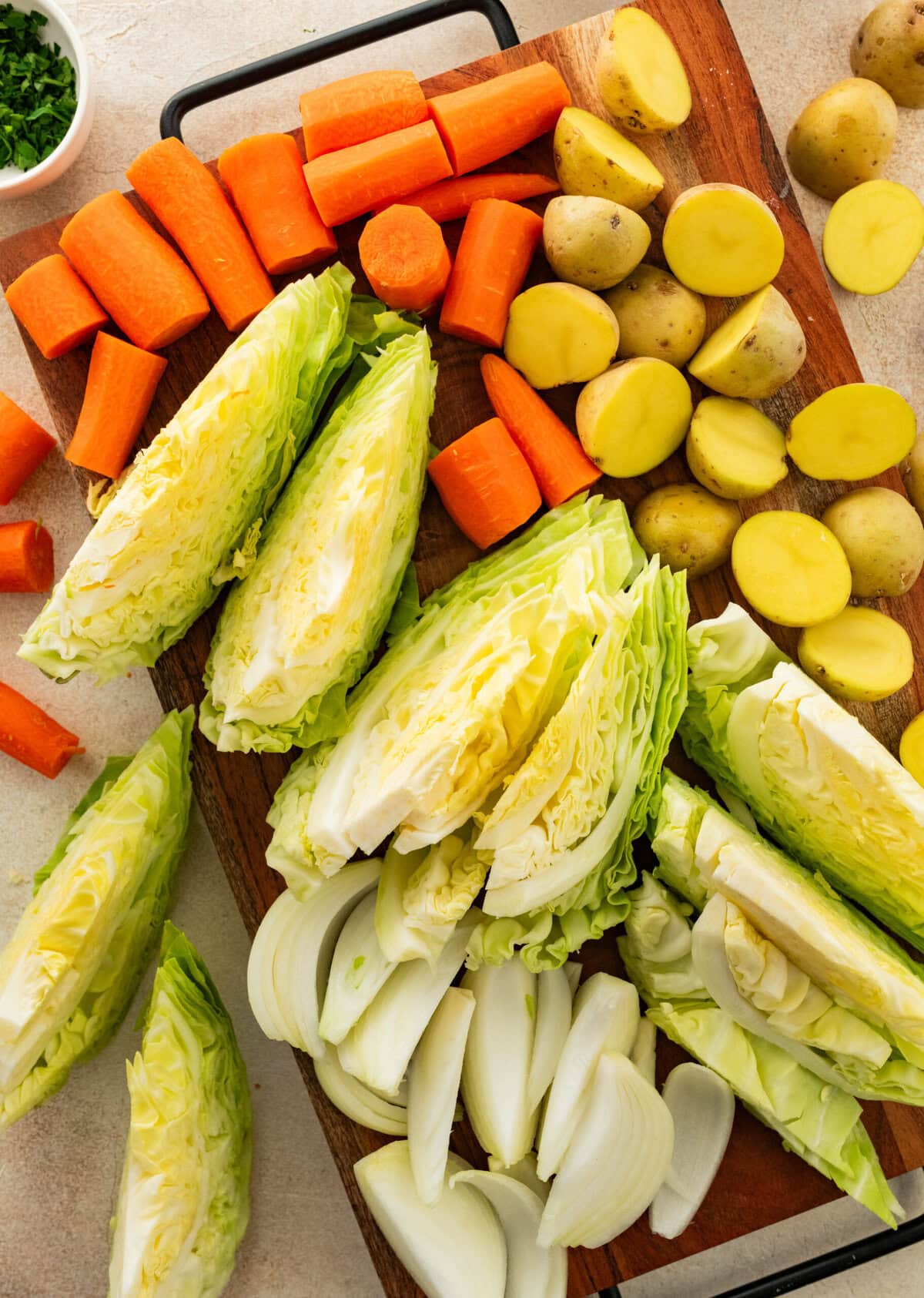 - Prep the vegetables: While the corned beef cooks, prep the vegetables. Core and cut the cabbage into wedges. Peel and wedge the onion. Peel the carrots and cut into large chunks. Halve the potatoes.