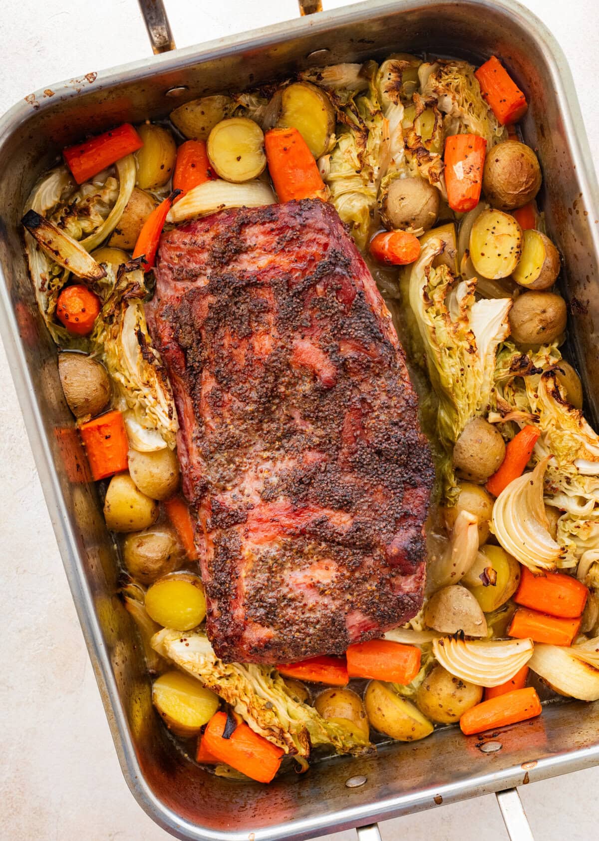 Roasted, not boiled. This baked corned beef and cabbage is juicy, flavorful, and finished with golden, caramelized vegetables.
