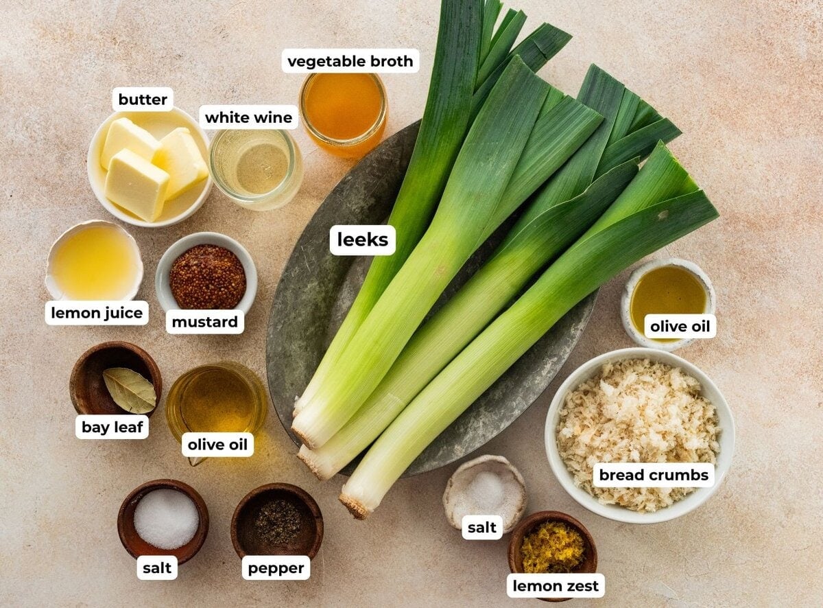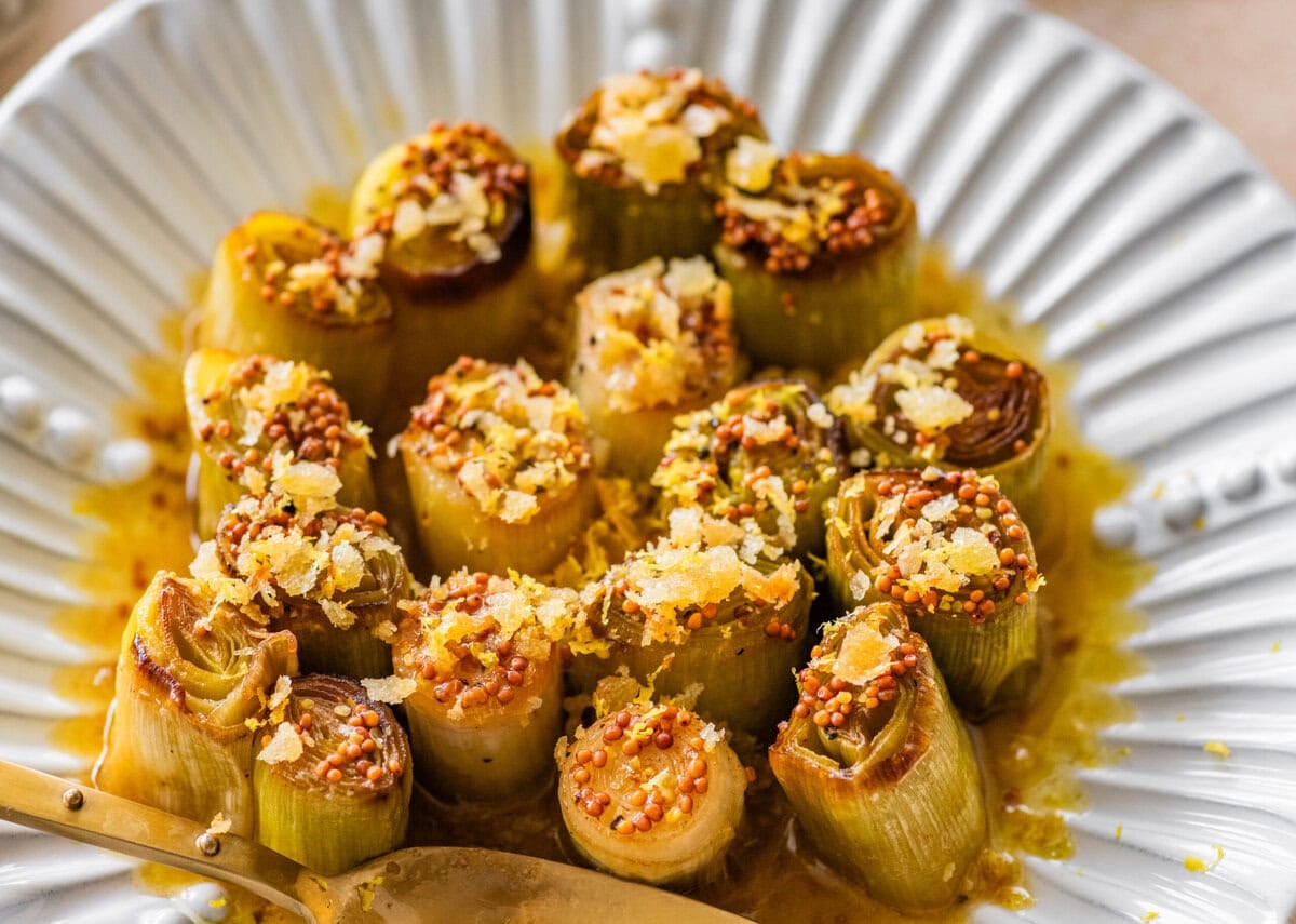 - Finish with Whole Grain Mustard & Lemon: In a small bowl whisk together: 1 tablespoon fresh lemon juice 2 teaspoons whole grain mustard. Spoon some of the warm pan juices into the mixture, stir to loosen, then drizzle back over the leeks. Gently spoon to coat.