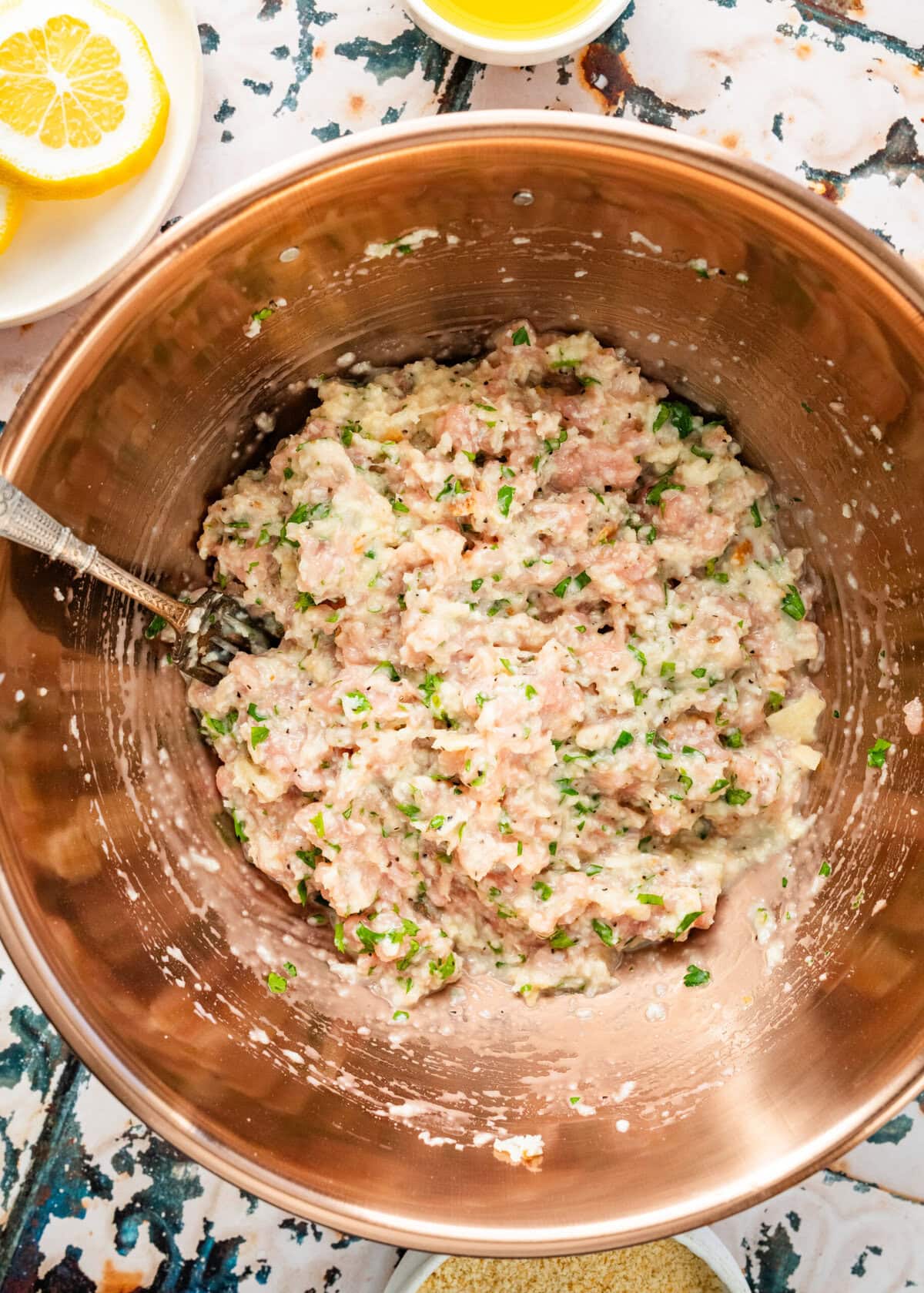 - Mix gently: Add the ground chicken, Parmigiano Reggiano, egg, parsley, garlic, salt, and pepper to the bowl. Mix gently with your hands until just combined—don’t overwork or the meatballs will be dense.