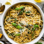 Lemon Garlic Pasta with Spinach is a simple yet flavorful dish made with tender pasta tossed in a garlicky olive oil sauce, fresh spinach, lemon, red pepper flakes, basil, and plenty of Parmigiano cheese. Ready in about 20 minutes, this light and satisfying pasta is perfect for an easy weeknight dinner made with just a handful of wholesome ingredients.