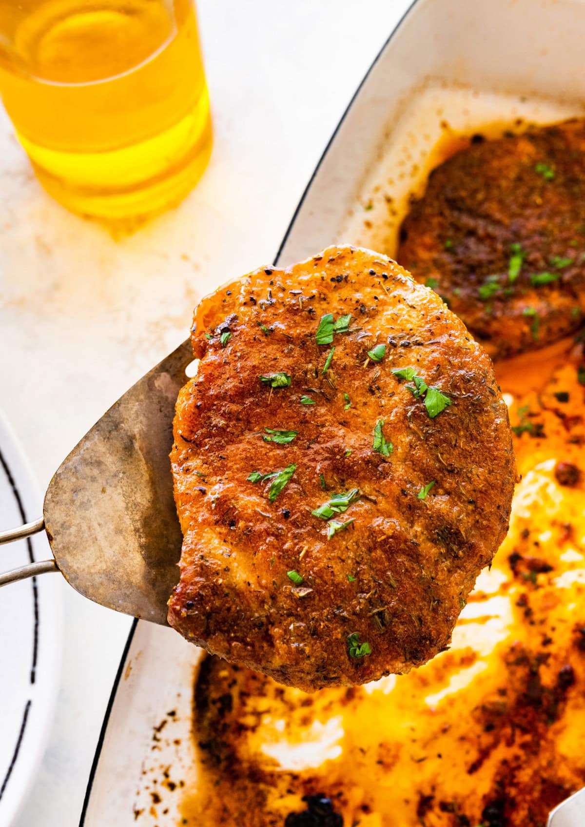 - Rest and Serve: Once cooked, remove the pork chops from the oven and let them rest for a 5 minutes before serving. This allows carryover cooking. Garnish with chopped fresh parsley before serving. Enjoy your juicy oven-baked pork chops!