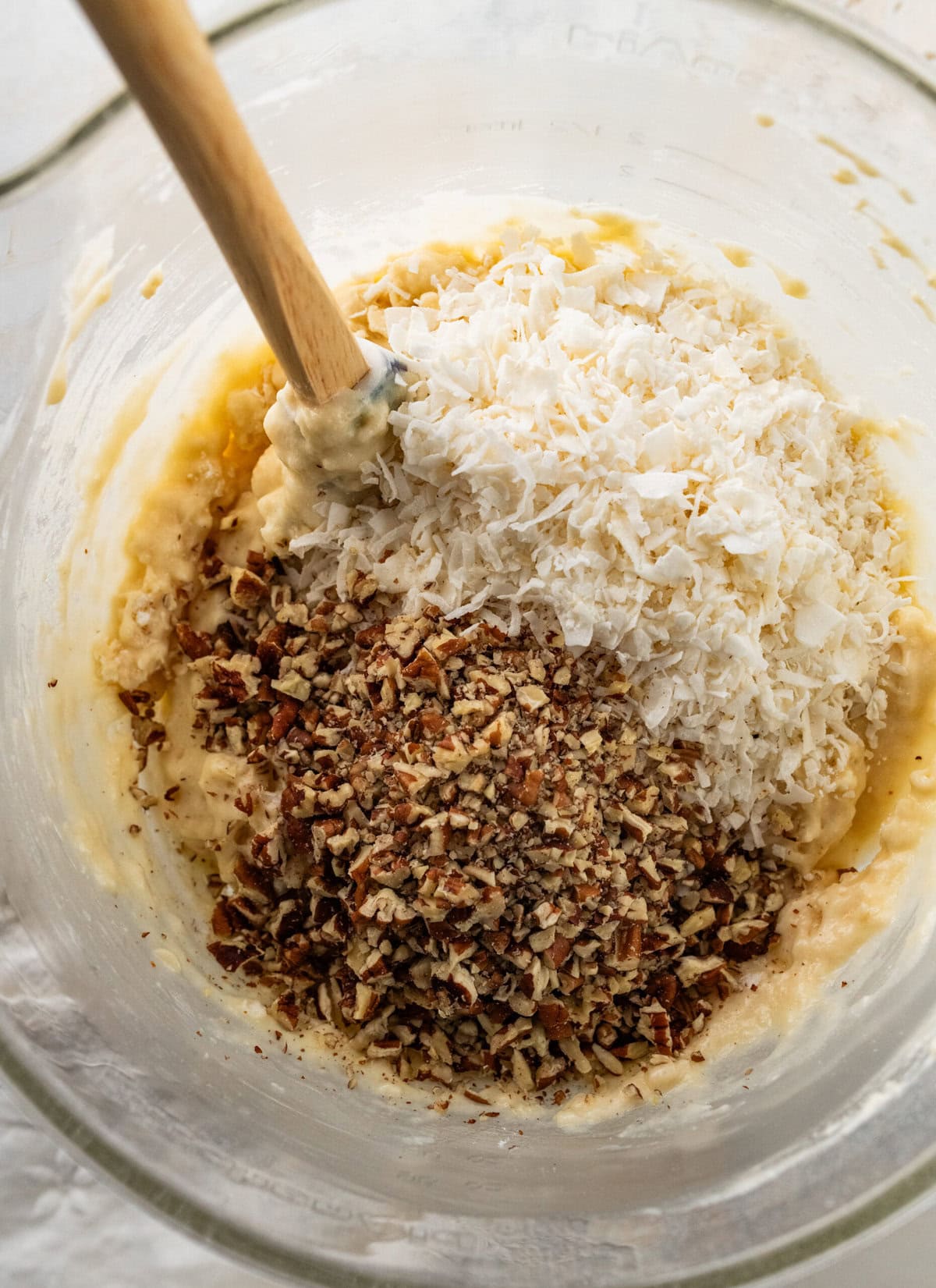 - Sift in the flour, baking powder, and salt over the top of the bowl with the wet ingredients. Gently fold the dry mixture into the wet ingredients until just combined—be careful not to overmix. Fold in the chopped pecans and shredded coconut until evenly distributed.