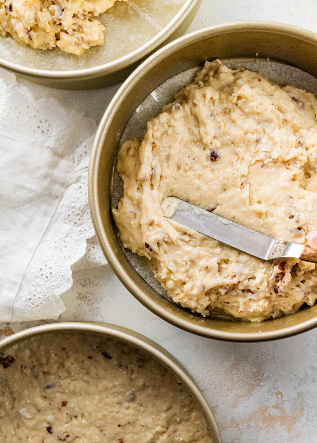 - Divide the batter evenly between the prepared pans and smooth the tops. Bake for 30–35 minutes, or until a toothpick inserted into the center of each cake comes out clean. Let the cakes cool in their pans for about 10 minutes, then transfer to a wire rack to cool completely.