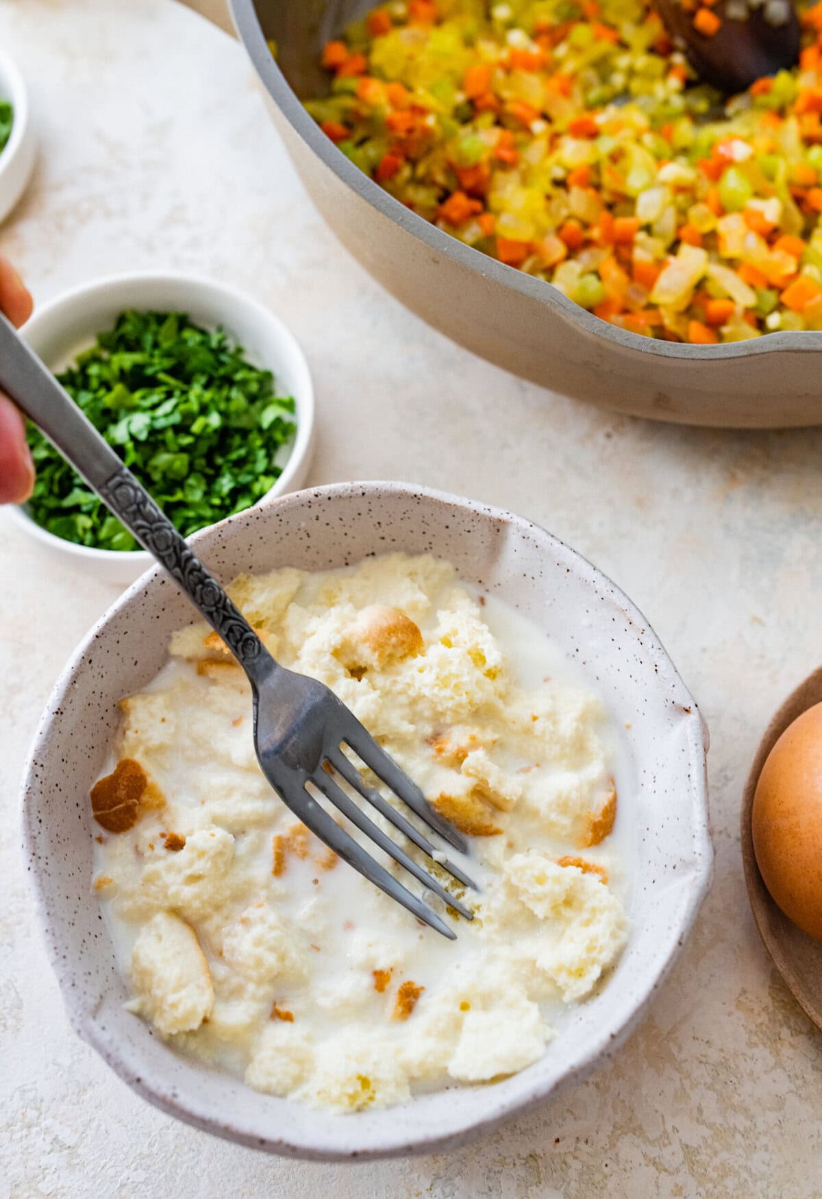 - In a bowl, combine the torn day-old bread with milk. Let soak until soft, then mash lightly with a fork.