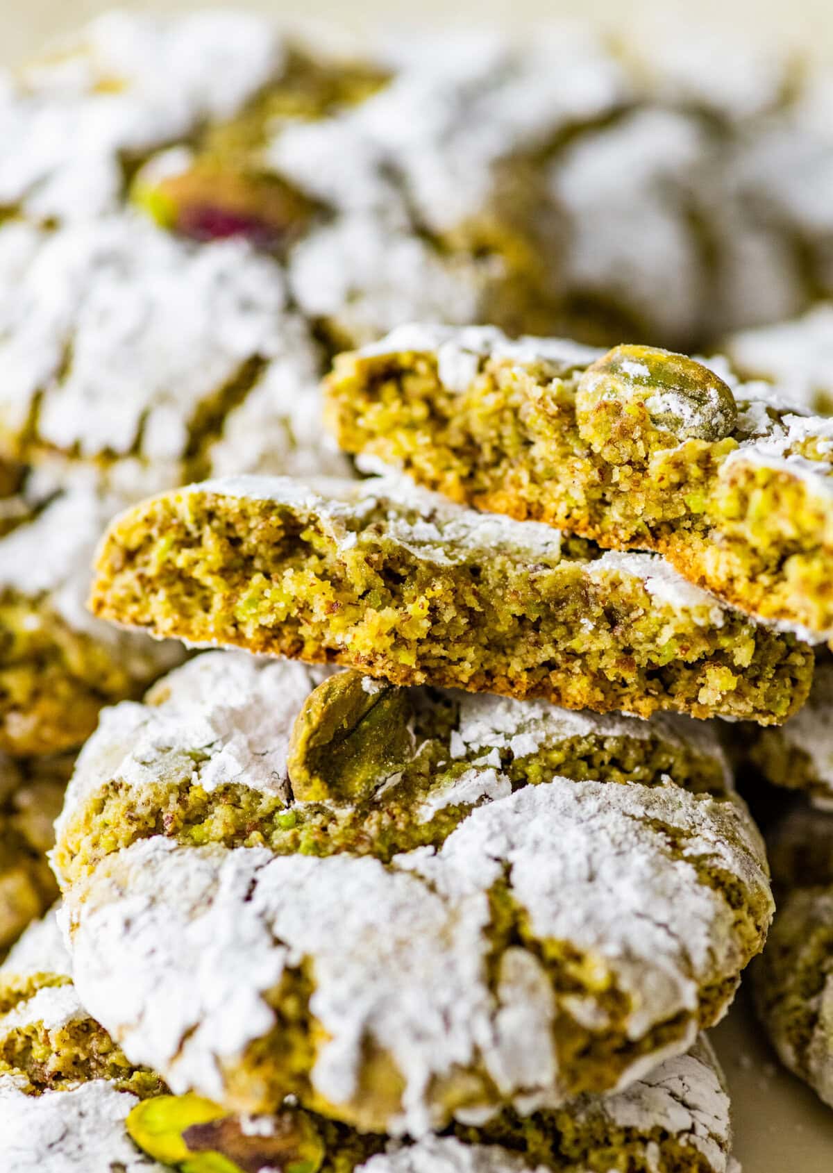 My pistachio cookies recipe will bring the warmth of an Italian bakery to your kitchen! With the ideal lightly crisp texture on the outside, while soft on the inside, and coated in just the right amount of powdered sugar.