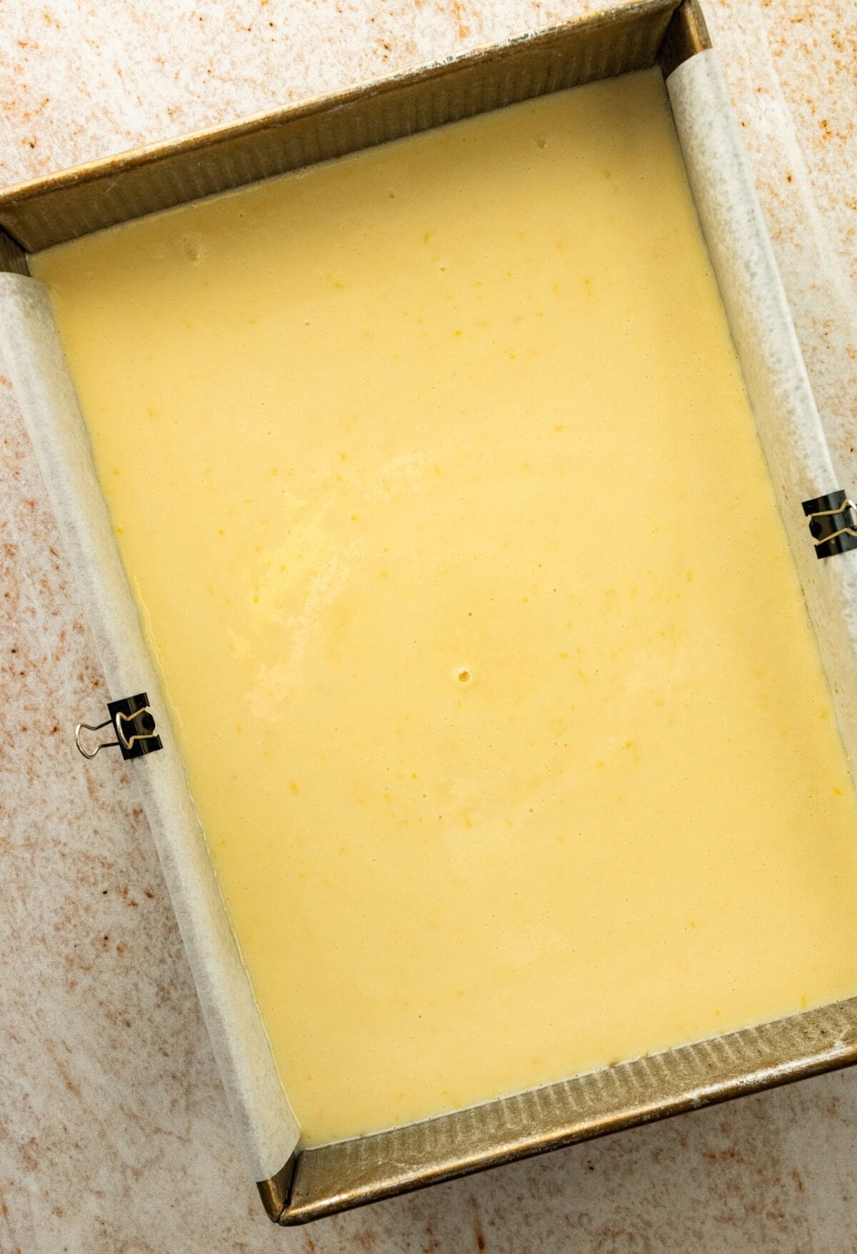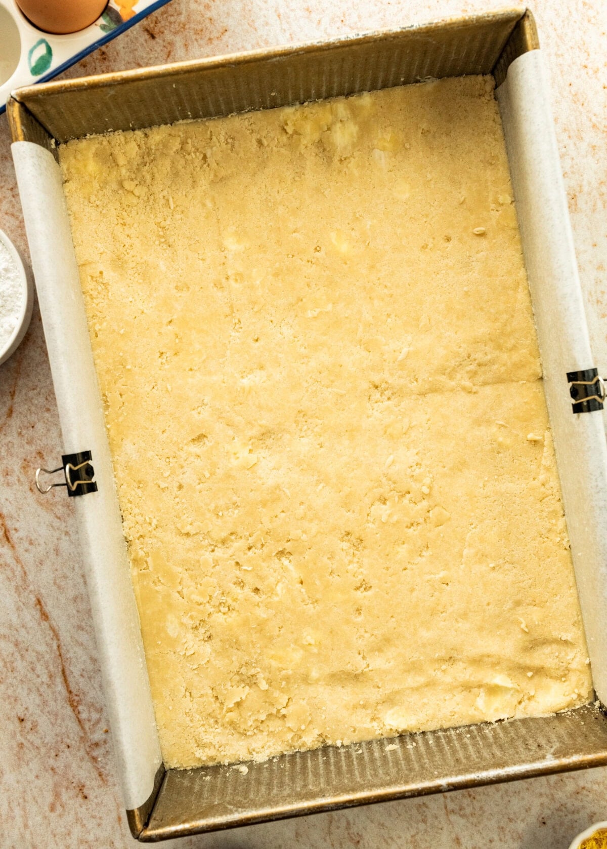 Step #1: Prep the pan and oven: Preheat oven to 350°F (175°C). Line a 9×13-inch baking pan with parchment paper or foil, leaving an overhang on the sides. Lightly grease. Make the shortbread crust: In a large bowl, mix butter, flour, powdered sugar, and salt until a soft dough forms. You can also use a food processor.