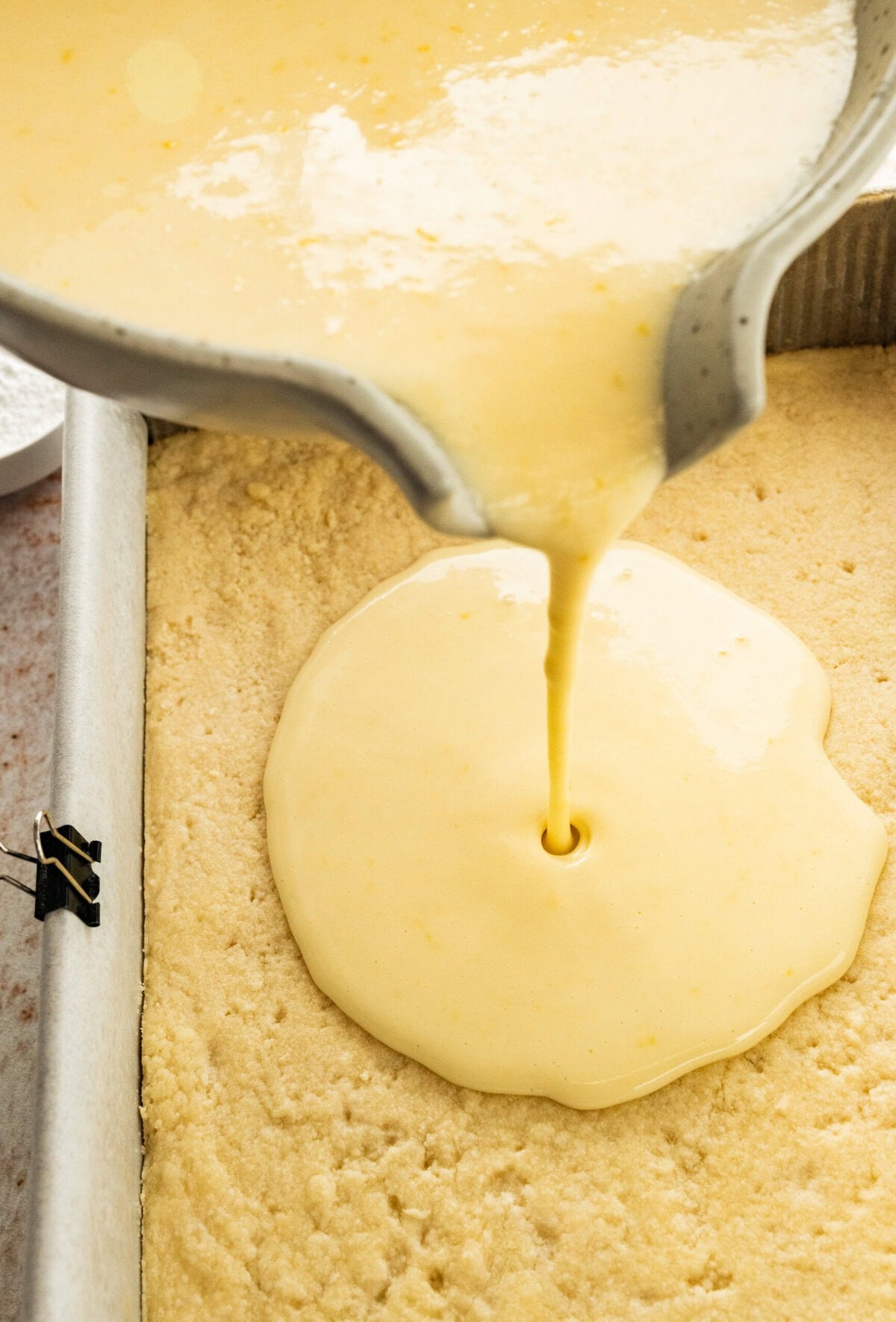 - Bake: Pour filling over the warm crust. Bake for 30-35 minutes, or until the center is set.