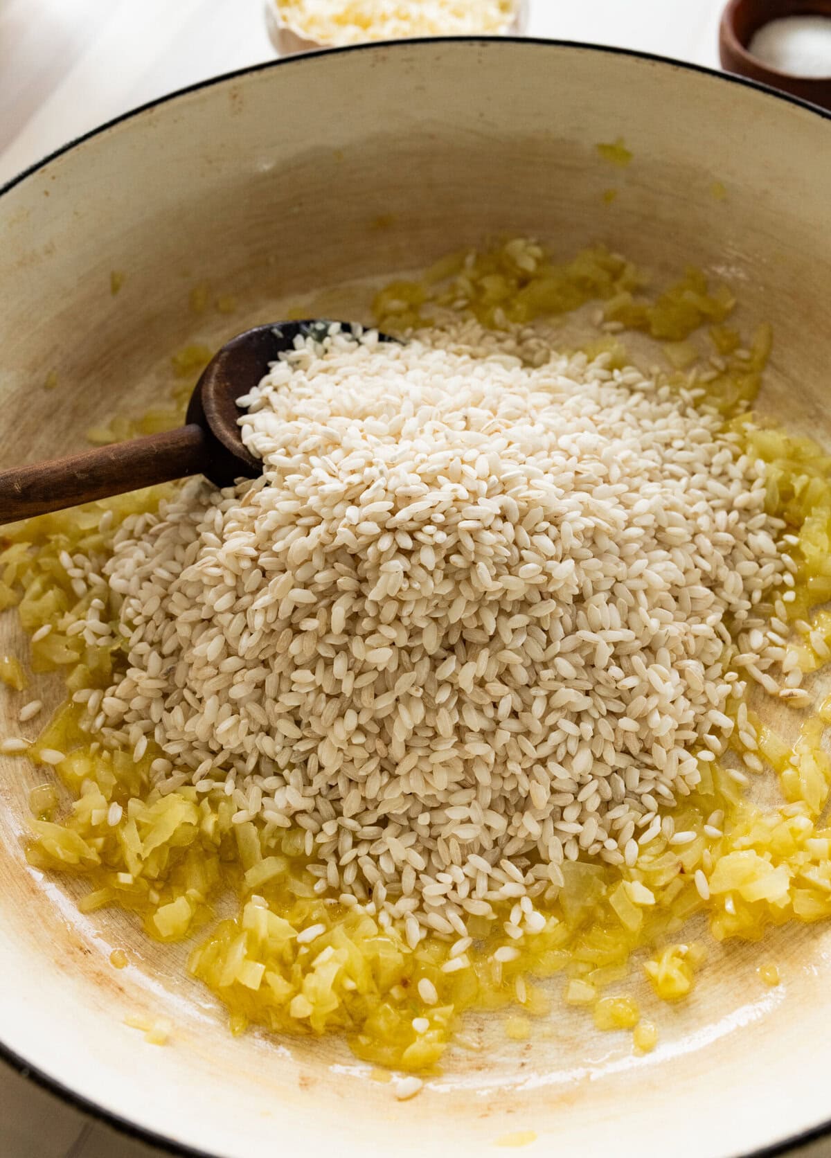 - Pour the broth into a saucepan and keep it at a gentle simmer. It must stay hot in a separate pot while the risotto cooks. In a heavy-bottomed pan or Dutch oven, heat olive oil over medium heat. Add the onion with a pinch of salt. Cook gently for 5 to 7 minutes until soft and translucent but not browned. Add the garlic and cook 30 seconds. Add the rice directly to the pan.