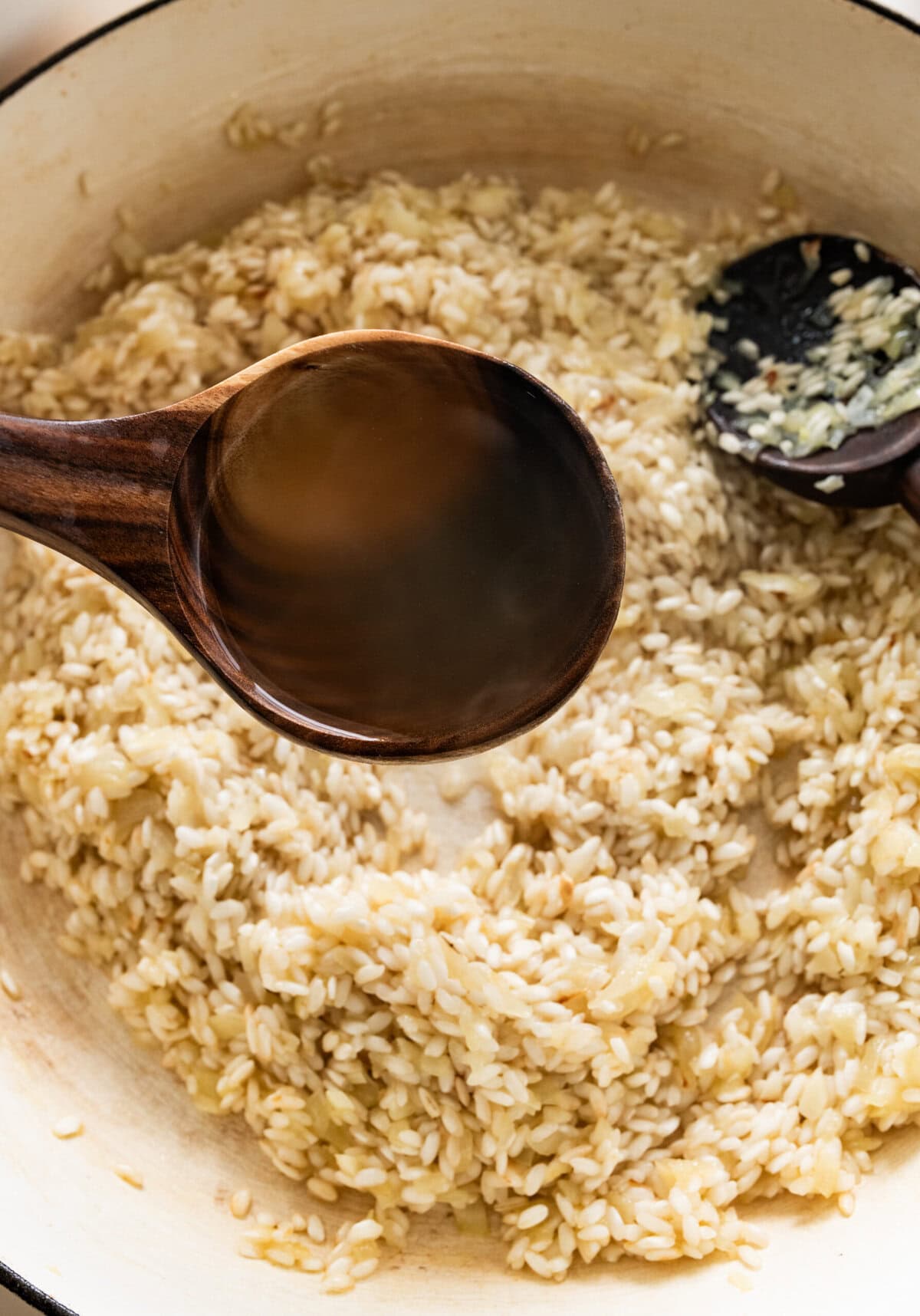 - Always use hot broth, or you’ll shock the rice and stop proper cooking