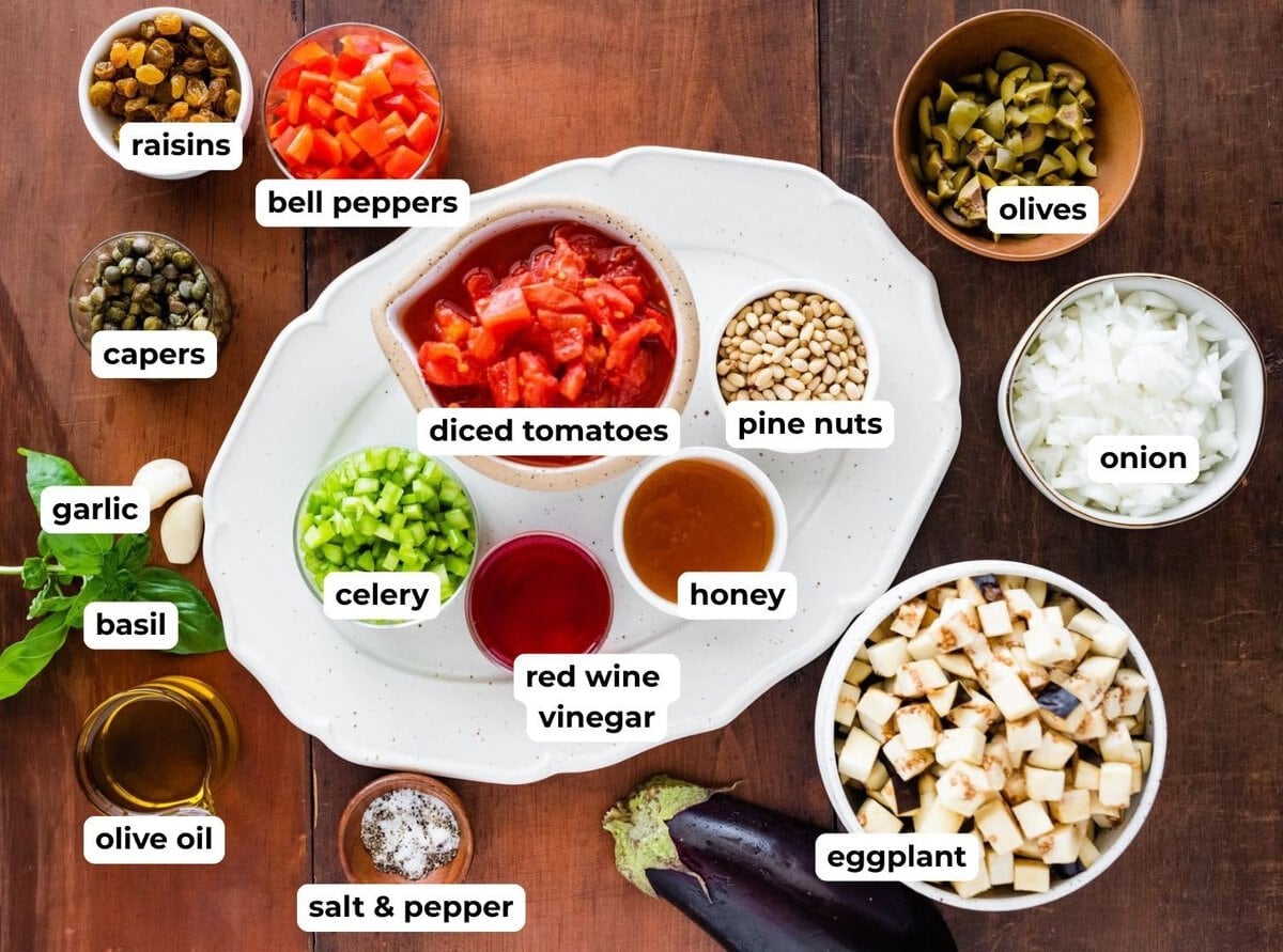 - Technique: Sauté eggplant, onion, and celery in olive oil. Stir in olives, capers, raisins, and tomato, then simmer gently. Finish with vinegar and herb.