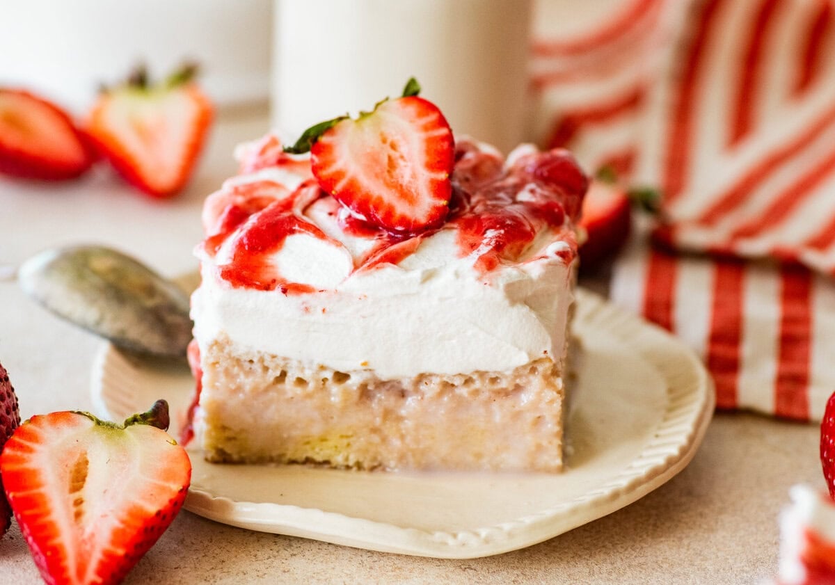 Strawberry tres leches cake is a light sponge cake soaked in a sweet three-milk mixture infused with strawberry syrup, then topped with whipped cream and fresh strawberries.