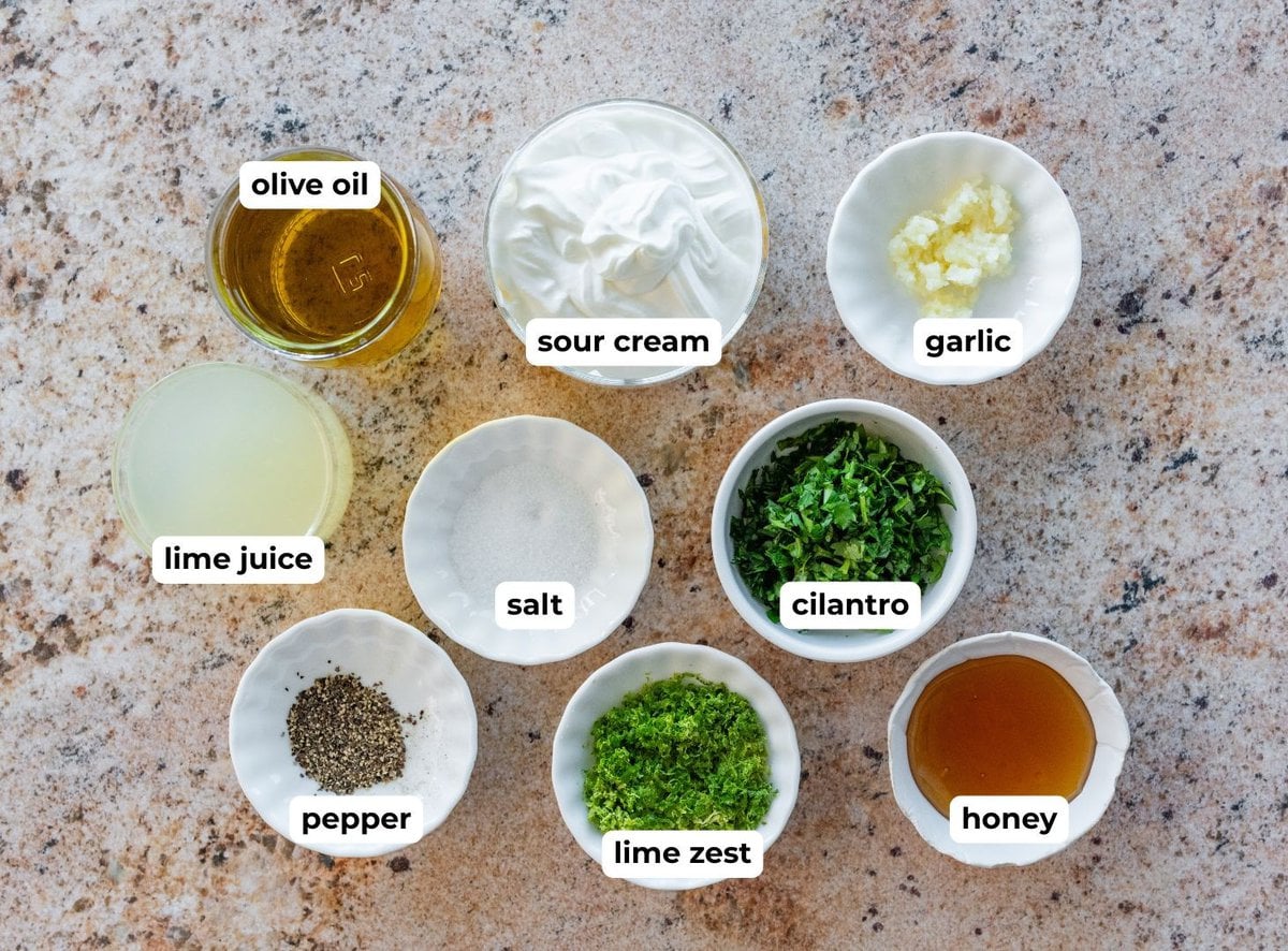 - In a blender, bowl, or jar, whisk together lime juice, zest, olive oil, sour cream, honey, garlic, cilantro, salt, and pepper until smooth and creamy. I like to blend it for an extra creamy texture.