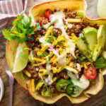 The best Tacos Salad Bowls in 35 minutes– Crispy, golden tortilla bowls filled with juicy taco meat, fresh crunchy lettuce, creamy avocado, and the dreamiest cilantro lime dressing you’ll ever drizzle on a salad. This isn’t just taco salad, it’s the kind of dinner that makes everyone gather and build their bowl exactly how they want.