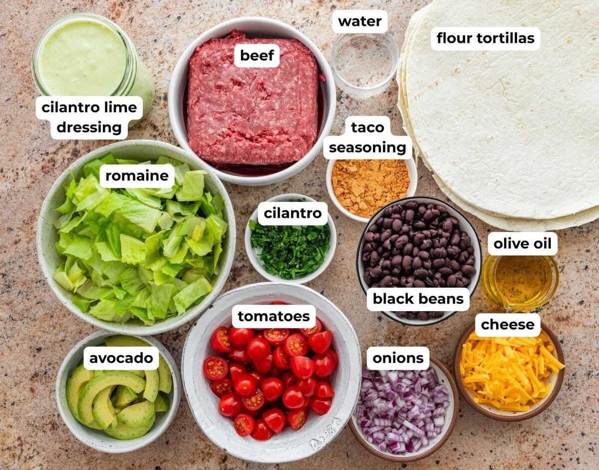 - Taco Meat: Lean ground beef (90/10) cooked with taco seasoning for a bold, savory flavor.